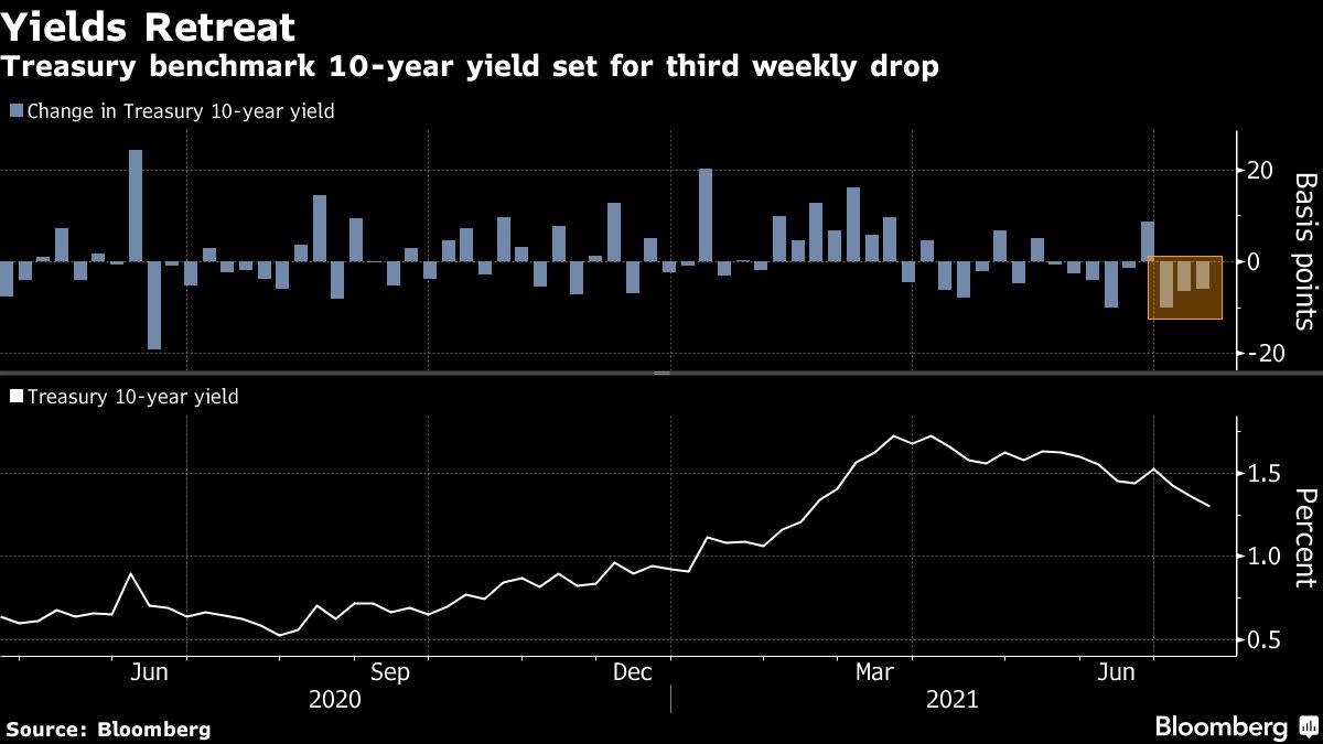 Energy and material shares led the S&P 500 lower, erasing a gain posed after a report showed June retail sales topped estimates. The S&P had closed at either a gain or a loss every other day this week. Moderna jumped after the vaccine maker was named to the U.S. equity benchmark. The 10-year Treasury note yield was on pace for a third week of declines.